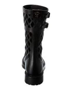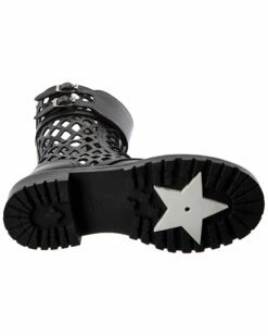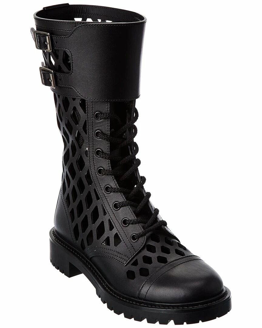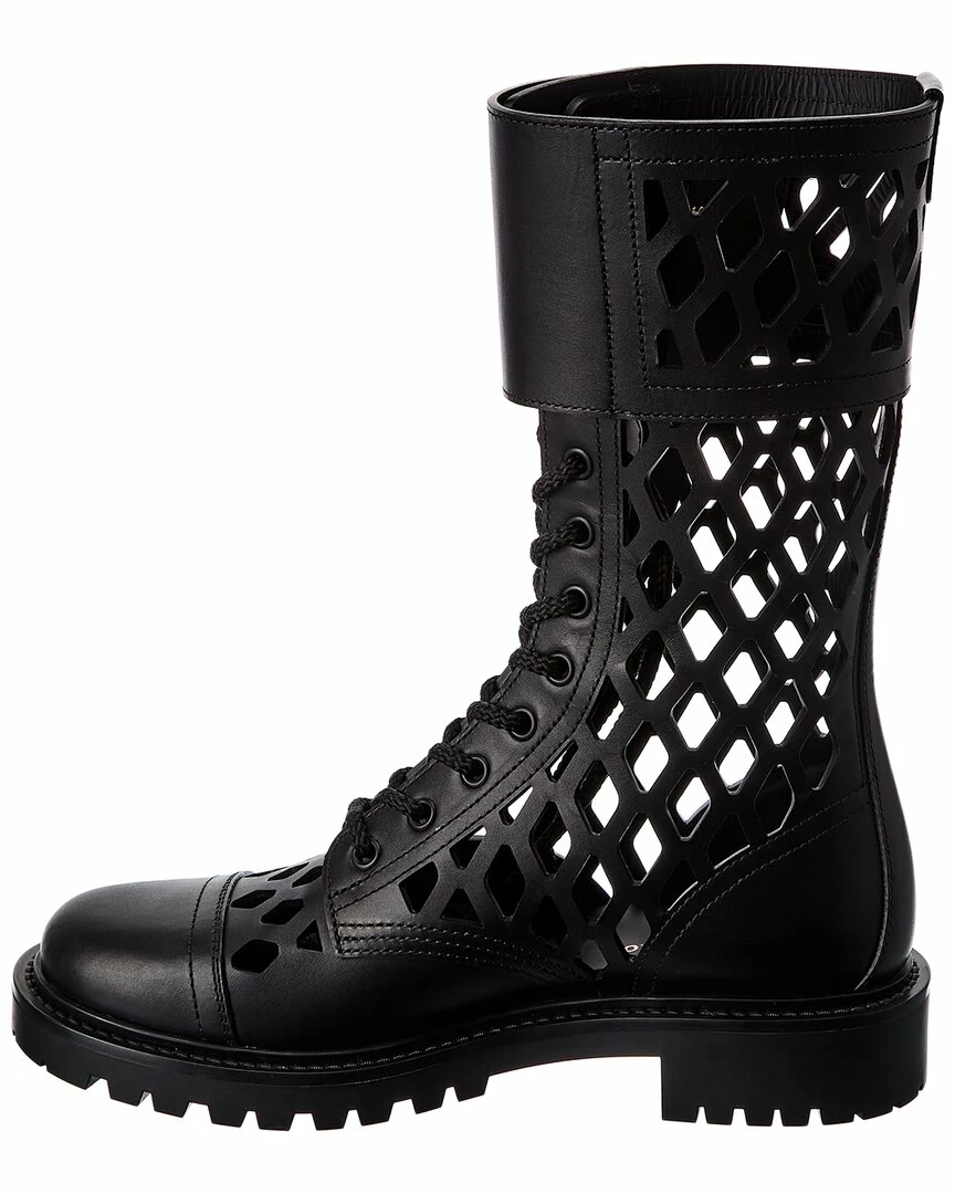 - D-Trap Leather Boot in black leather and silver-tone hardware with cutout design and buckle accents