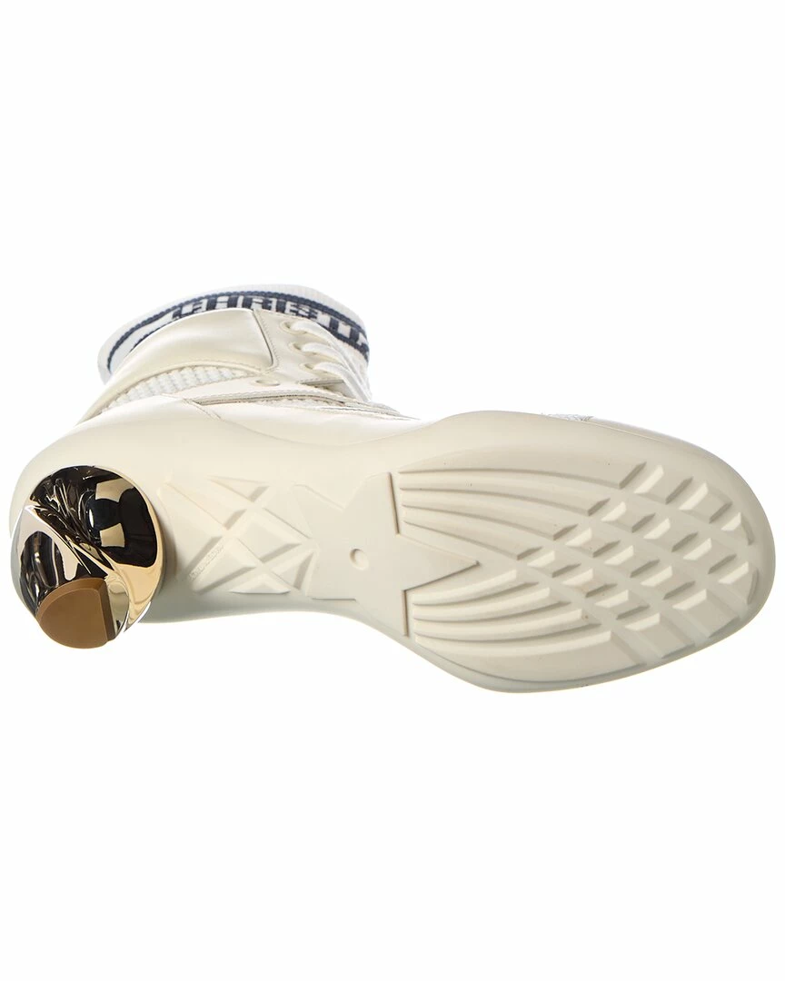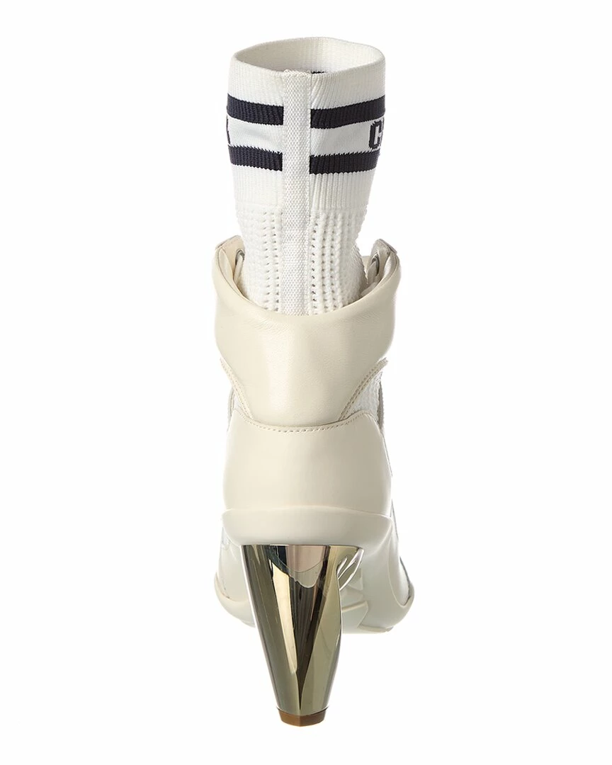 - D-Zenith Knit & Leather Bootie in white knit textile and leather and gold-tone hardware with sculptural heel and ribbed logo sock cuff