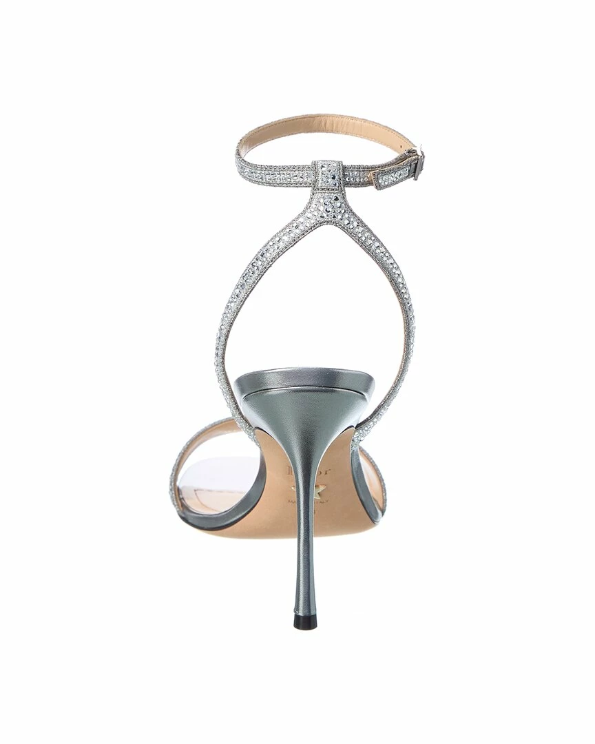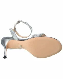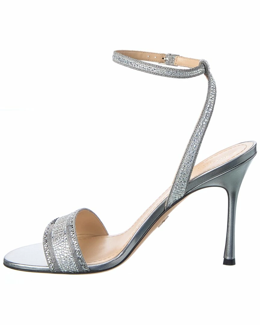 - DWay Canvas & Leather Sandal in silver canvas and leather and silver-tone hardware with crystal embellishments