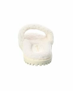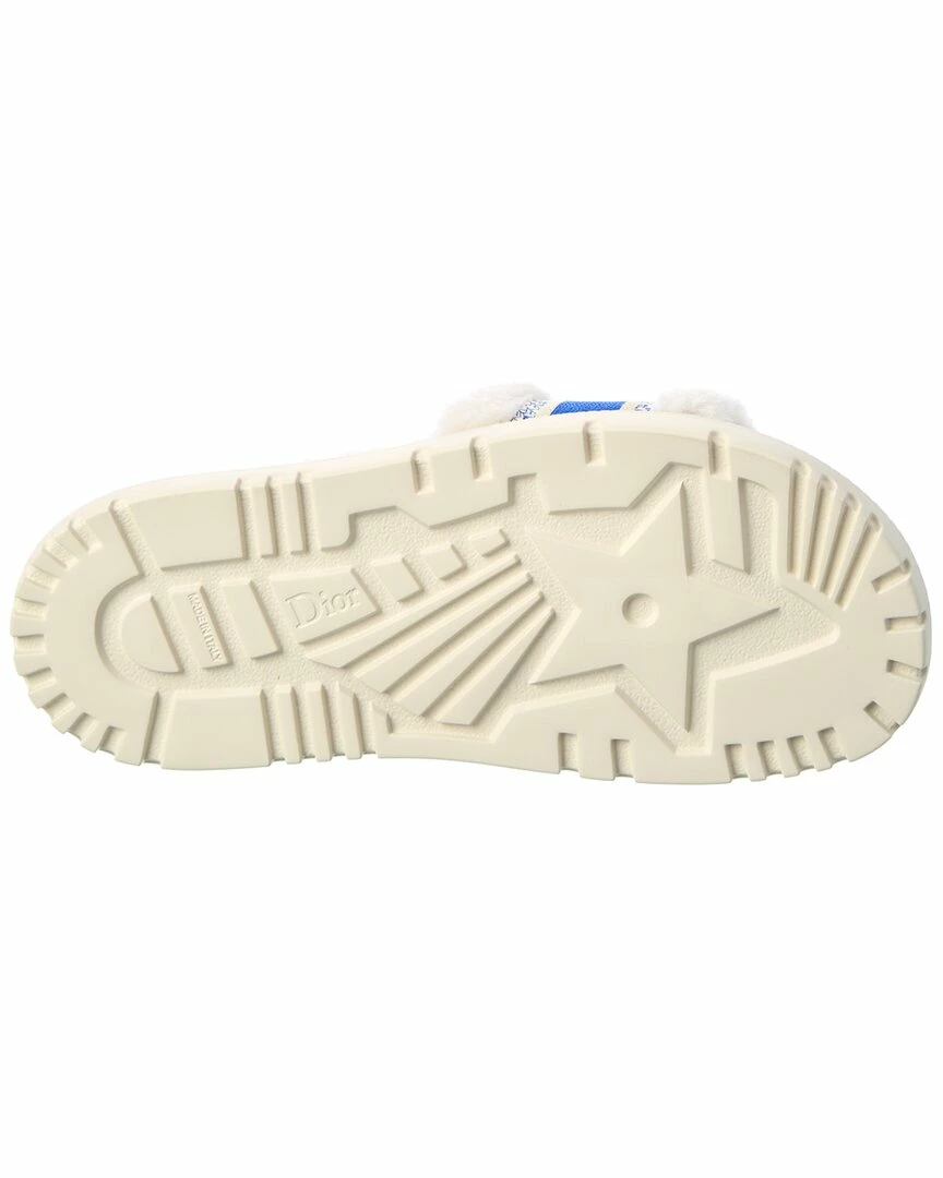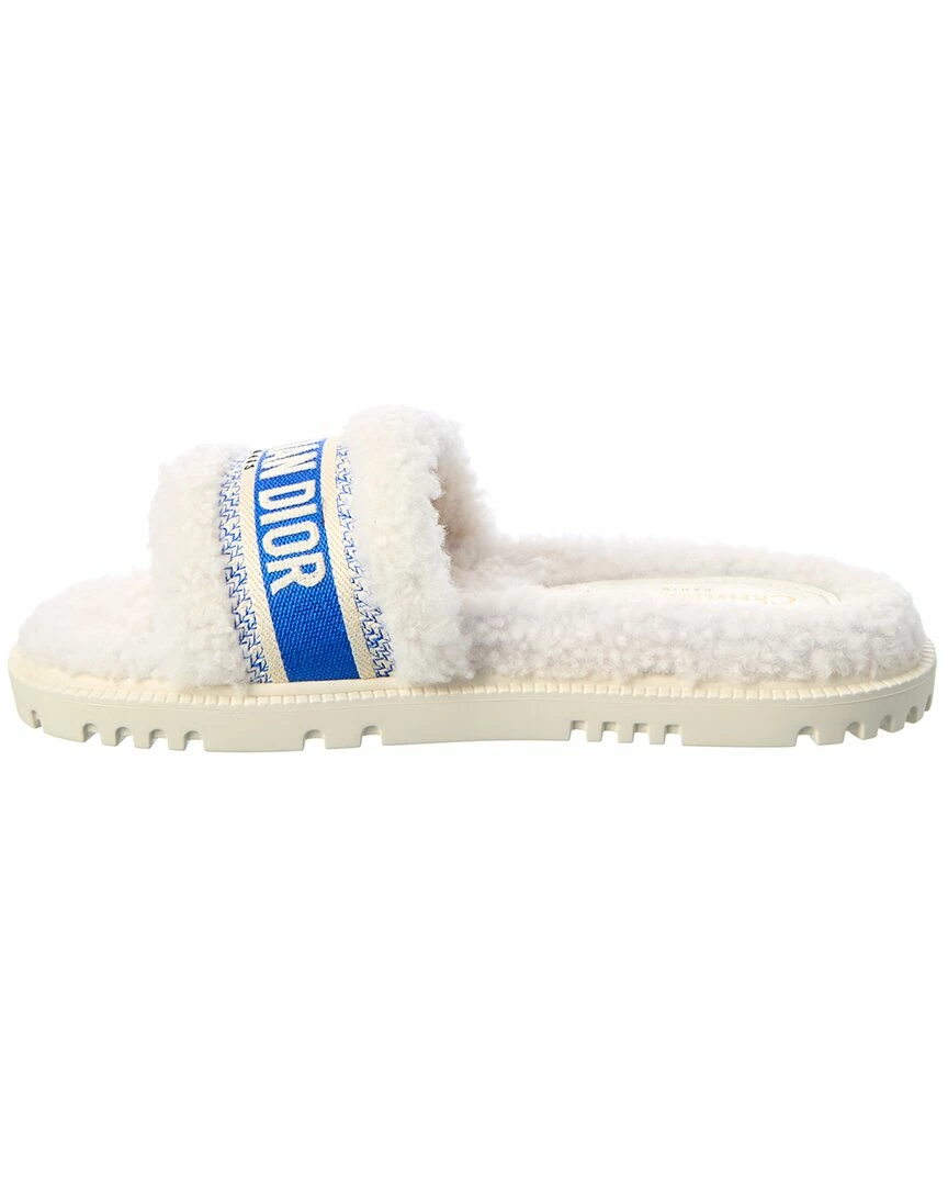 - DWay Shearling Slide in white shearling with embroidered logo stripe