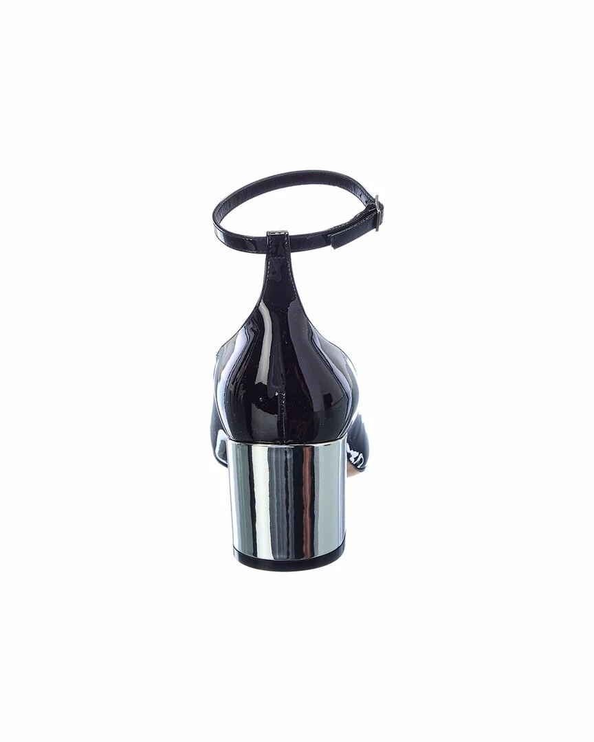 - La Parisienne D Patent Pump in black patent leather and silver-tone hardware with engraved logo plaque and metal heel
