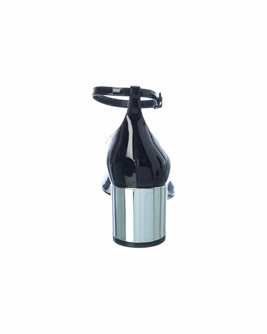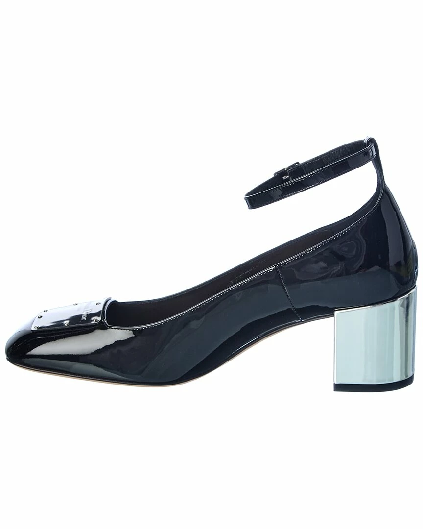 - La Parisienne Patent Pump in black patent leather and silver-tone hardware with engraved logo and metallic heel